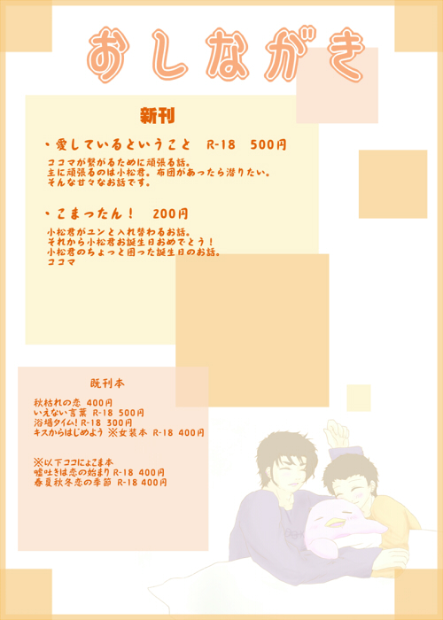 書き忘れましたが、既刊も新刊も全部ココマです。